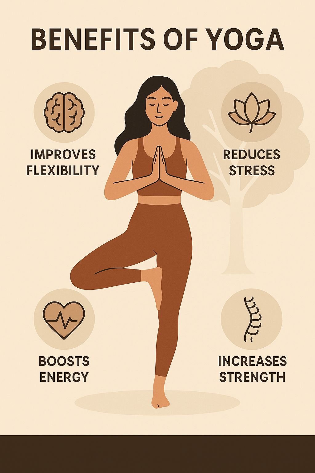 Yoga stretches muscles gently and regularly, making the body more flexible. This helps reduce stiffness and prevents injuries.
